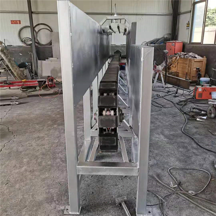 产品概述.主要用于毛猪的输送,配合自动放血输送线使用,将毛猪悬挂吊起便于刺杀放血,沥血干净肉色鲜艳等特点,本机由驱动部分、机架及板链,托胸块等部分组成。